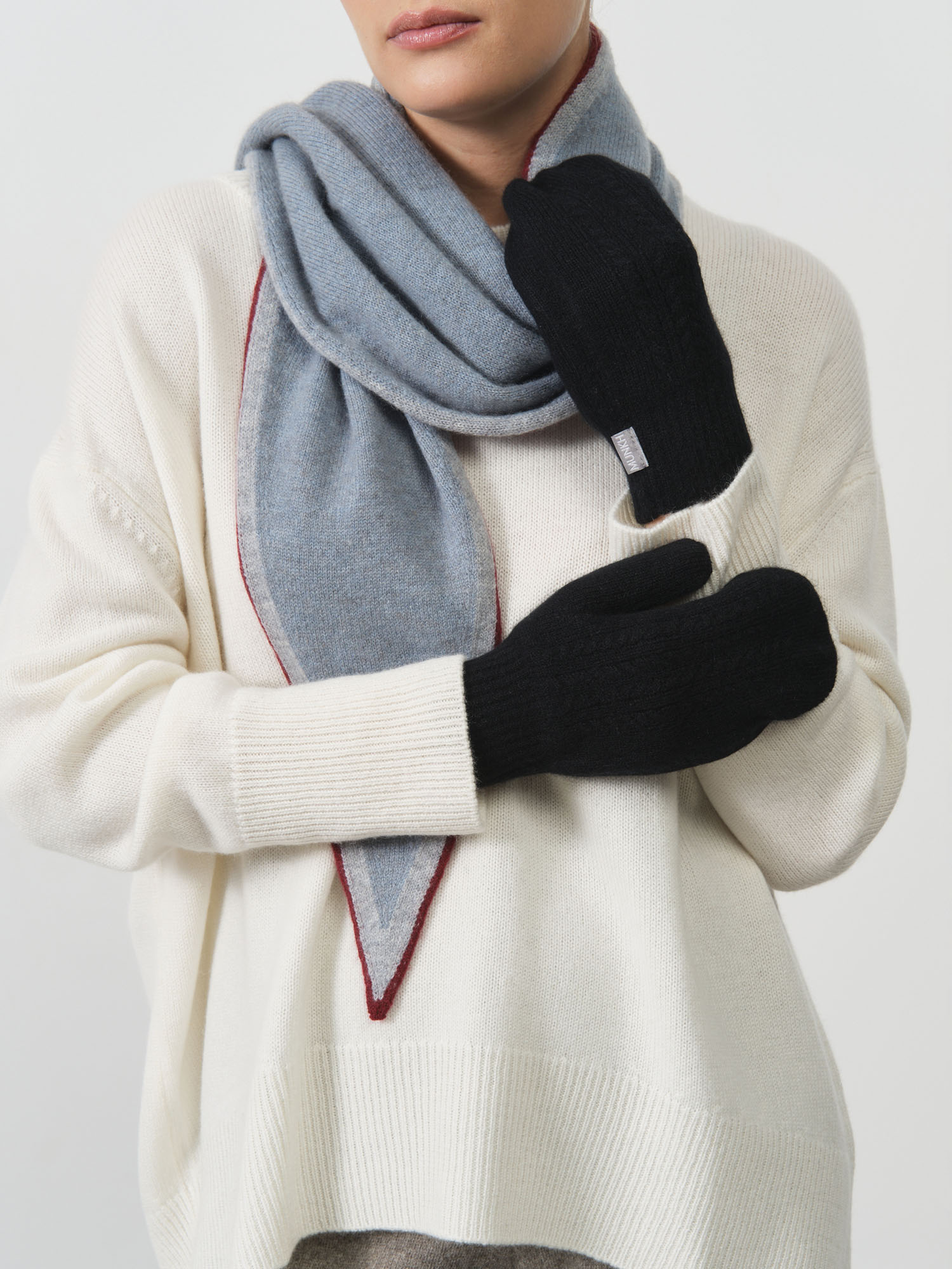 Модель выполнена в мягкой треугольной форме, что позволяет красиво драпировать изделие вокруг шеи или носить как лёгкую накидку. Контрастная окантовка по краю добавляет изделию выразительности и аккуратно подчёркивает форму аксессуара.