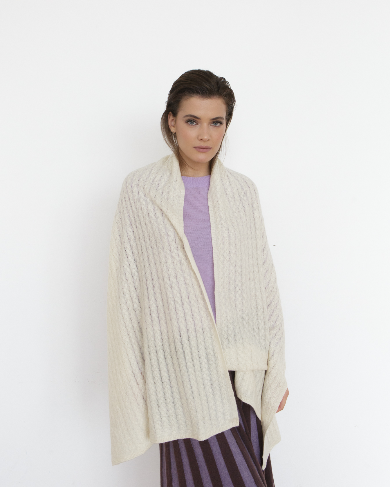 Дизайн и детали: Прямоугольная форма с аккуратной фактурной вязкой и мягкими складками. Минималистичный дизайн делает изделие универсальным и подчеркивает благородство материала.