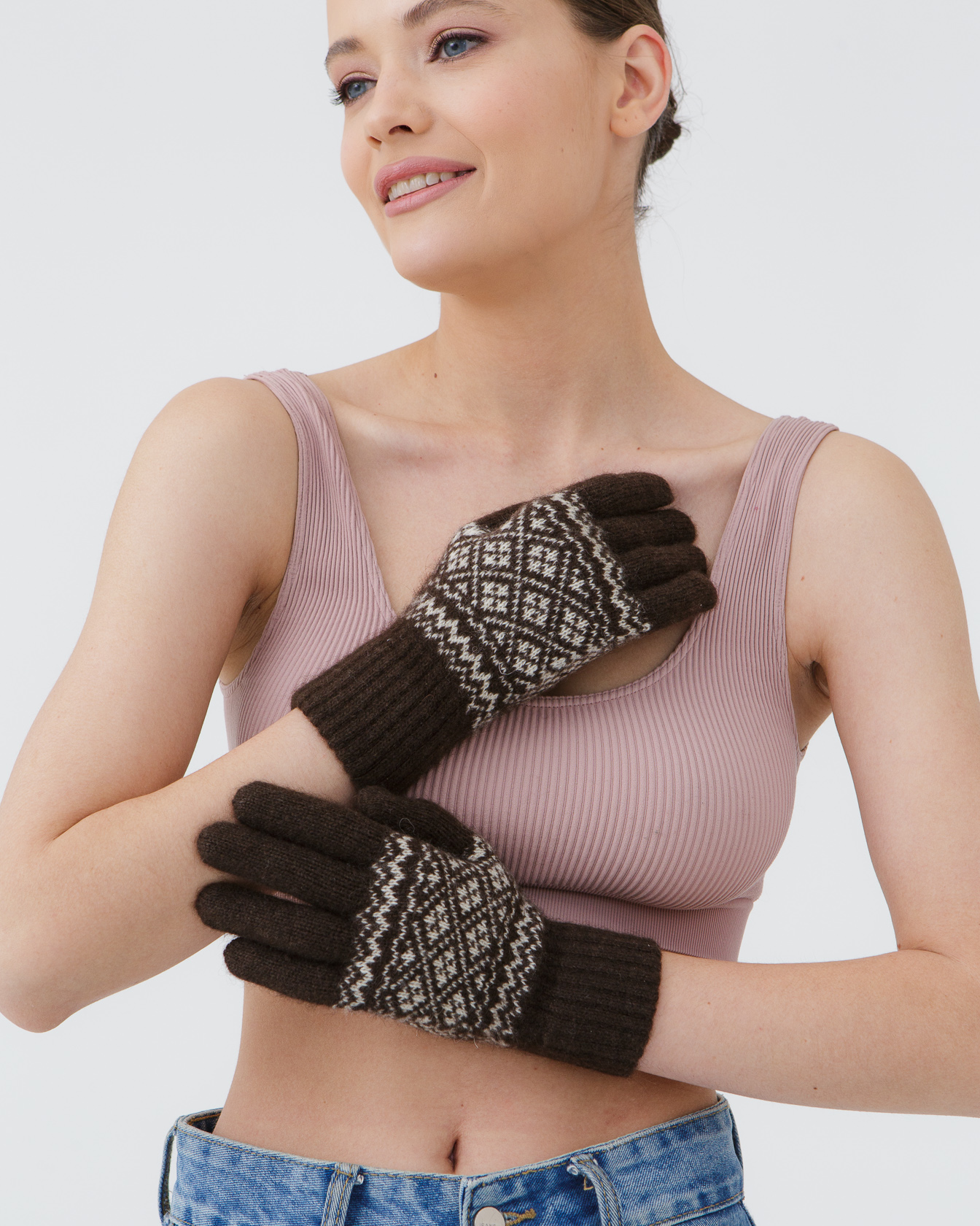 Эти перчатки из пуха яка темно-коричневого цвета — незаменимый аксессуар для холодного времени года. Изготовленные из натурального пуха яка, они обеспечивают превосходную теплоизоляцию, позволяя вашим рукам оставаться в тепле даже при низких температурах. Элегантный геометрический рисунок придает перчаткам стильный вид, подходящий как для повседневного использования, так и для особых случаев. Эластичные манжеты обеспечивают плотное прилегание, предотвращая проникновение холода. Мягкие, легкие и прочные, эти перчатки станут вашим любимым аксессуаром для зимы.