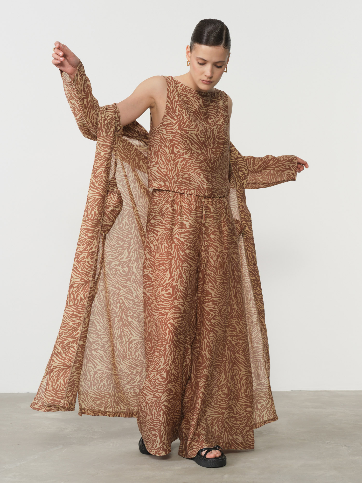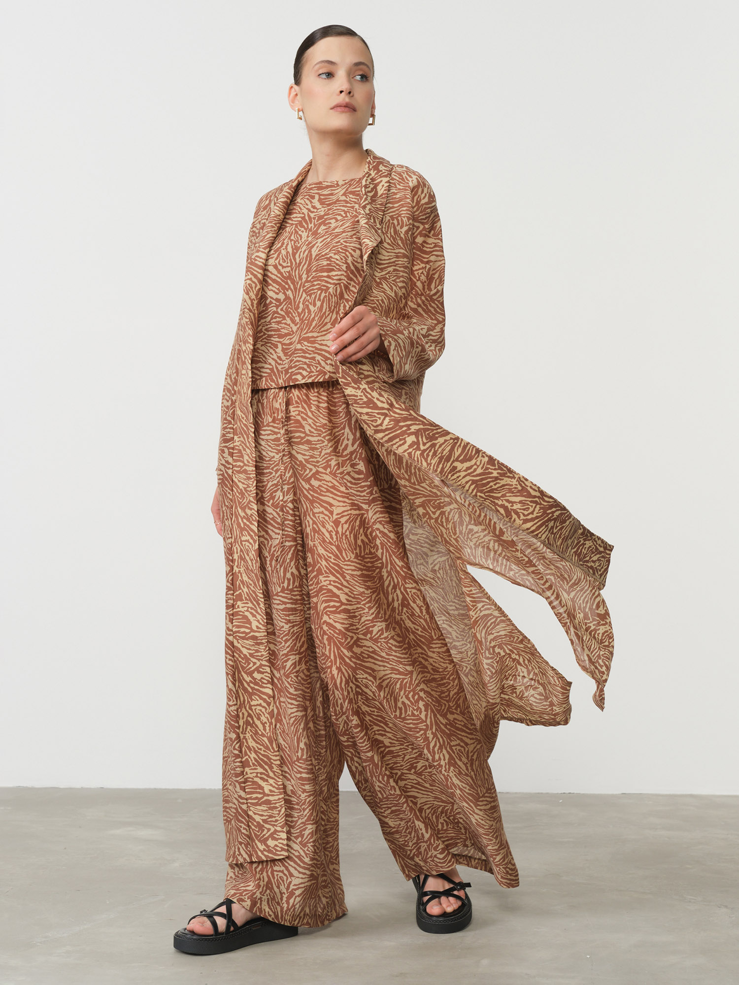 Свободный удлинённый крой в стиле кимоно с плавными линиями. Лёгкая ткань красиво драпируется и придаёт образу динамику.