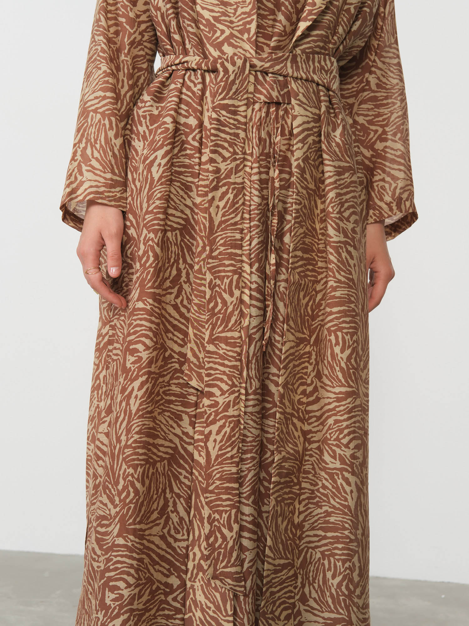 Пояс в тон для регулировки посадки, длинные рукава, струящаяся фактура ткани, аккуратная обработка краёв, эффектный разлёт пол при движении.