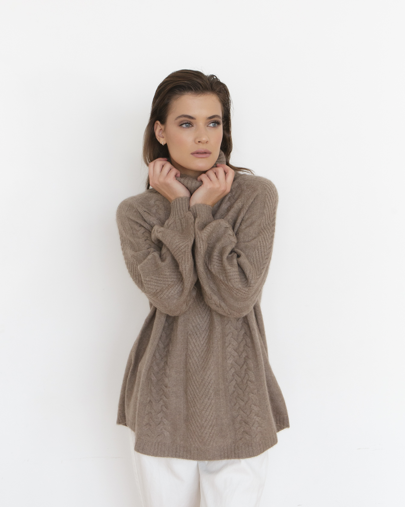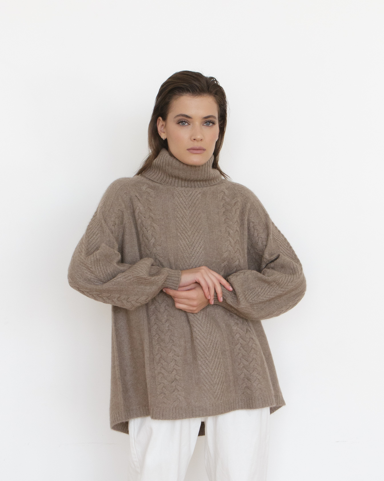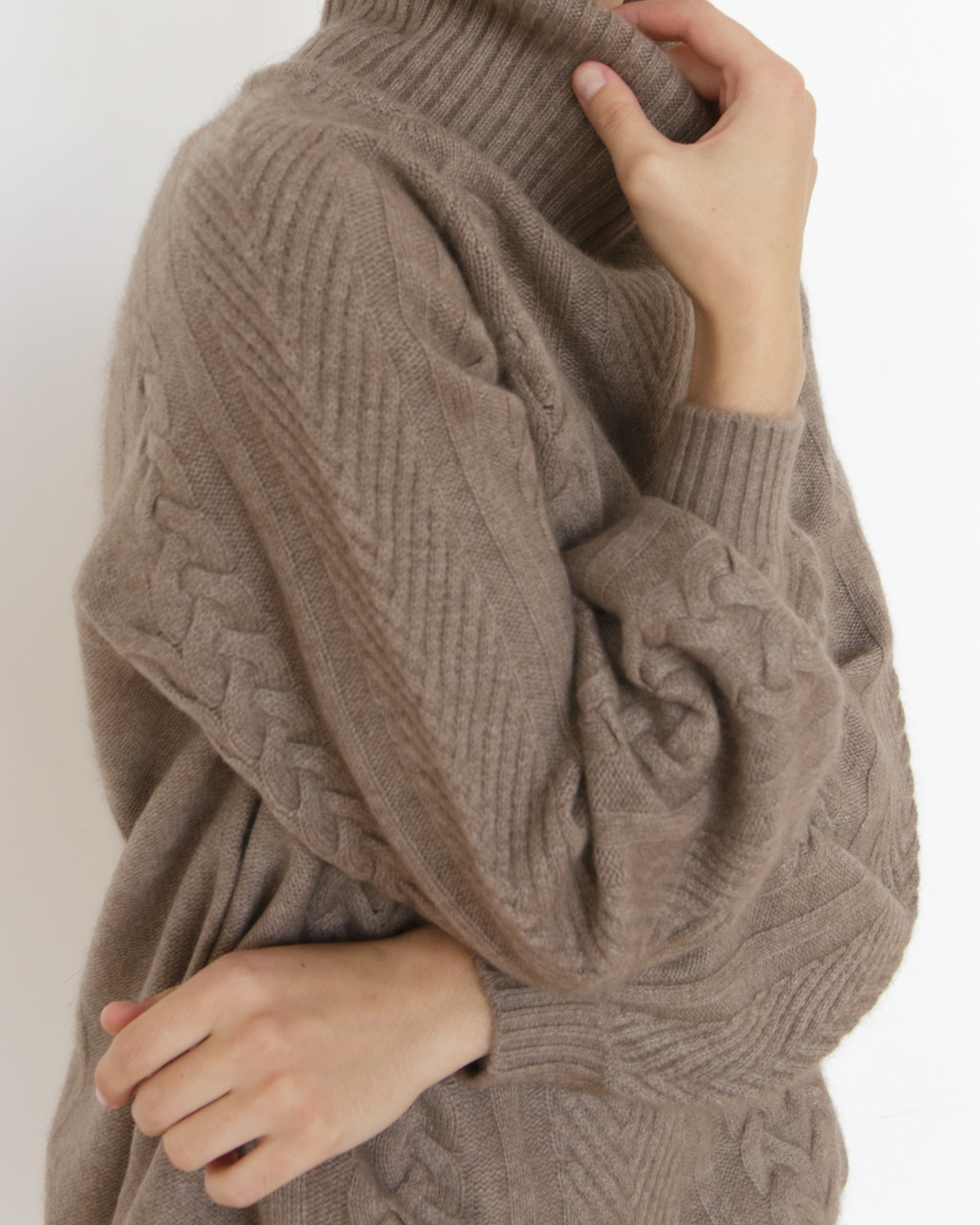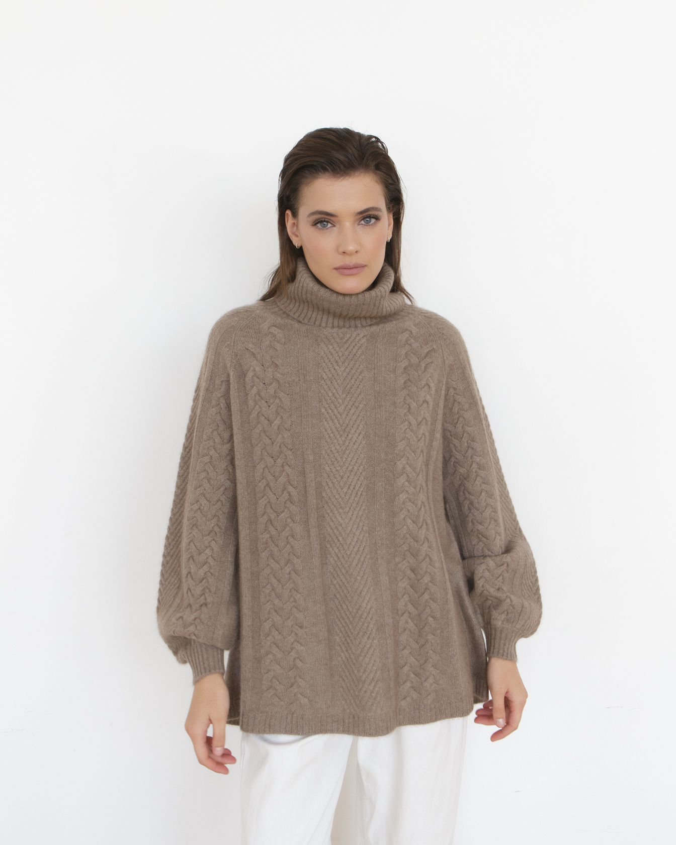 Модель выполнена с высоким воротником и объёмными рукавами. Фактурная вязка с вертикальными и косыми узорами придаёт изделию выразительность и подчёркивает благородную текстуру кашемира.