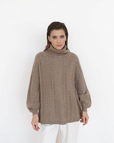 Высокий мягкий воротник, декоративная фактурная вязка, свободные рукава и аккуратная трикотажная отделка манжет и низа изделия.