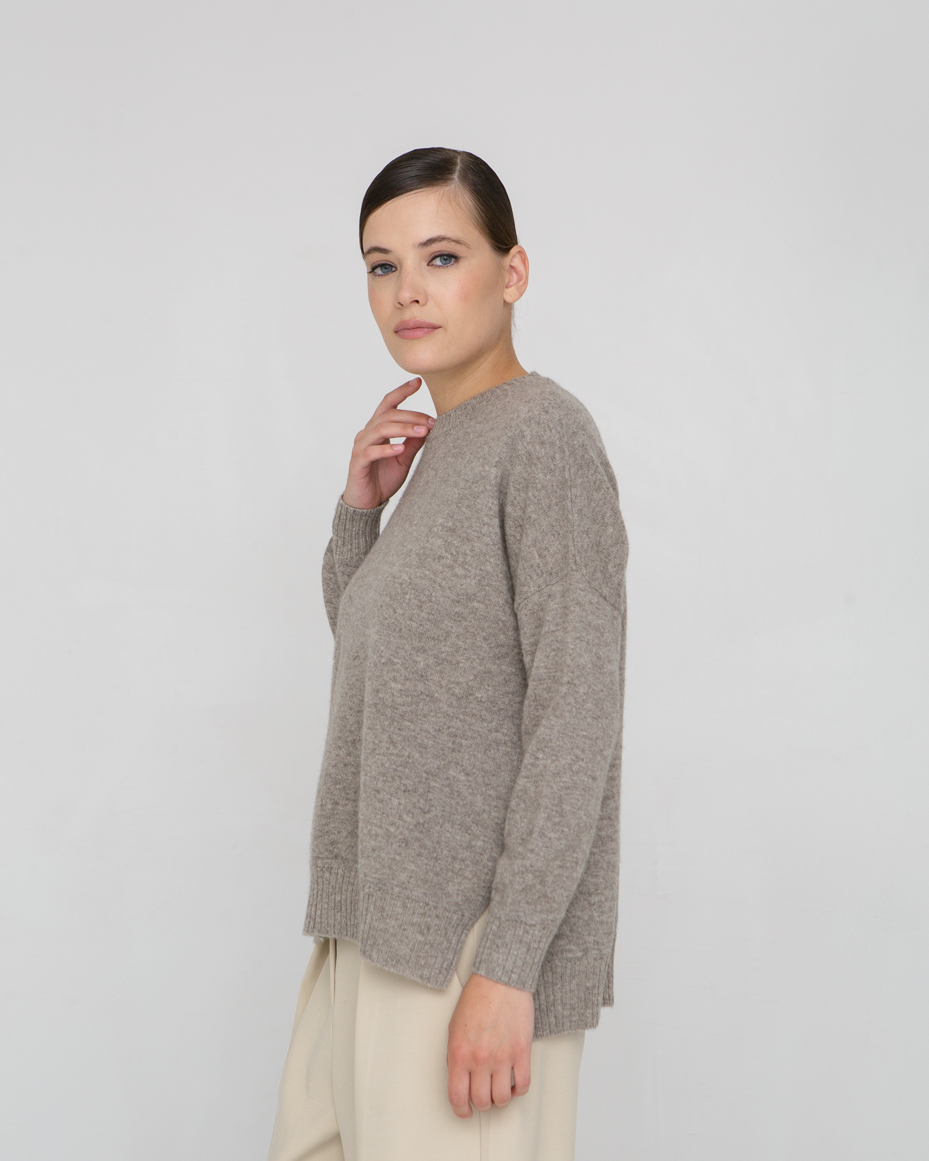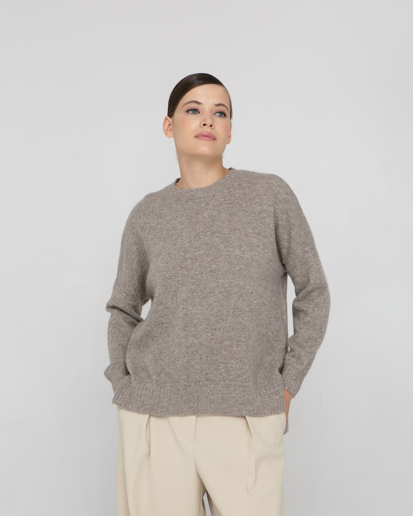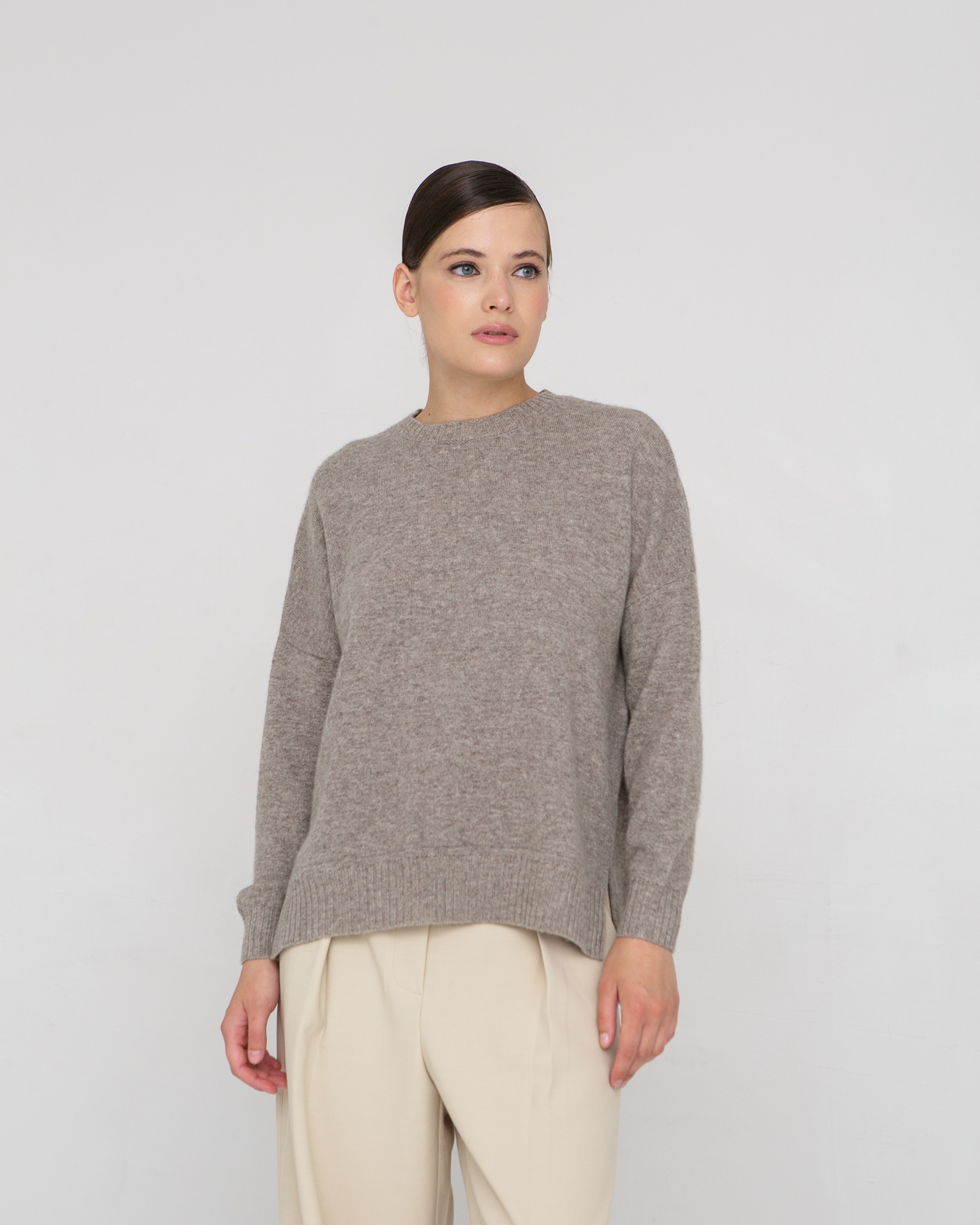 Модель выполнена в минималистичном стиле с круглой горловиной и длинными рукавами. Лаконичный крой подчёркивает естественную фактуру материала и делает джемпер универсальным элементом базового гардероба.