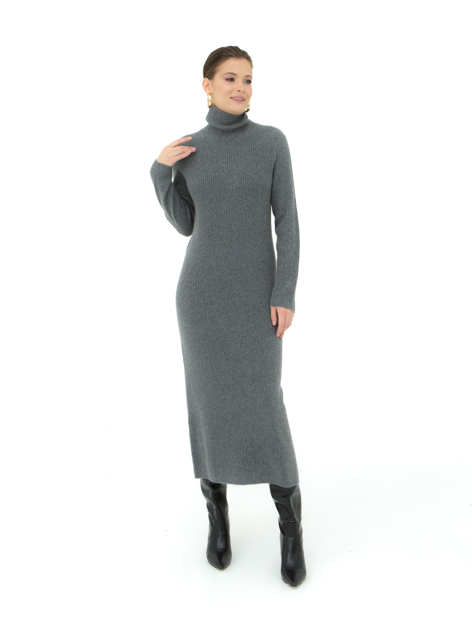 Элегантное платье из кашемира в цвете графит — идеальный выбор для холодного сезона. Благодаря мягкому и уютному материалу, это платье подарит вам комфорт в течение всего дня, а высокая горловина добавляет стиль и защищает от ветра.